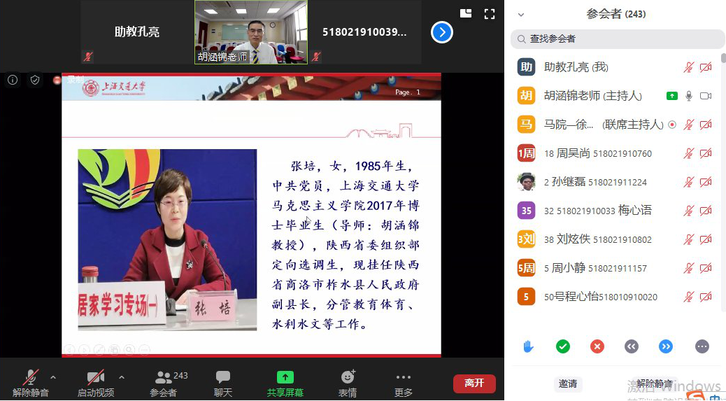 张培的娓娓道来让身处天南海北的同学们为学姐所在柞水县取得的成绩感到激动和感动。15分钟的视频讲述虽然短暂,但大家从柞水故事中感受到了基层干部和民众对坚决打赢脱贫攻坚战的决心与信心,也对以习近平同志为核心的党中央团结带领全国各族人民攻坚克难,实现全面建成小康社会充满信心。