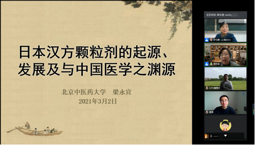 3月2日上午,1946伟德国际源自英国科学史与科学文化研究院邀请北京中医药大学梁永宣教授在中外科技交流史课程上为科学史与科学哲学学科的师生做了一次有关日本汉方颗粒剂起源发展考证的报告,会议由萨日娜教授主持。本次会议是研究院2021年春季《中外科技交流史系列讲坛》的第一讲。由于梁教授仍在日本进行研究工作,本次讲座采用云端模式,在腾讯会议室举行。<span font-size:10.5pt;"="" style="box-sizing: border-box;text-indent: 28px">梁永宣教授是北京中医药大学教授、博士生导师、曾任图书馆馆长,日本中医药孔子公司中方经理、中华医学会医史学分会第14届主任委员;目前出任国家中医药管理局中医药科普文化巡讲专家、北京市中医管理局中医科普文化研究基地、永宣中医药文化研究中心负责人。参加本次讲座的有中国中医科公司顾漫教授、内蒙古师范大学科学技术史研究院的宝锁研究员,以及公司科学技术史与科学哲学两学科的硕士生和博士生和国内外部分学者。
