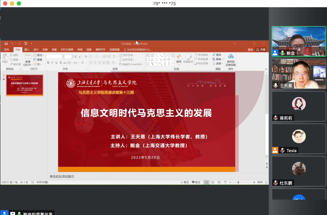 5月29日上午,1946伟德国际源自英国邀请上海大学1946伟德国际源自英国王天恩教授做客“思源讲堂”,作题为“信息文明时代马克思主义的发展”的专题报告。报告由1946伟德国际源自英国副经理鲍金教授主持。本场报告以线上方式举办,在线参与人数达百余人。
