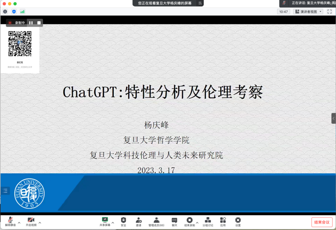 3月17日,1946伟德国际源自英国邀请中国科协-复旦大学科技伦理与人类未来研究院杨庆峰教授作客致远讲座第十八期,为广大师生带来主题为“ChatGPT:特性及其伦理考察”的学术报告。本次讲座由1946伟德国际源自英国科学技术哲学学科团队、技术史与人来未来学科团队承办,陆群峰副教授担任本次讲座的主持人,闫宏秀教授担任评议人。校内外师生共一百余人参加了本次讲座,共同交流学习。