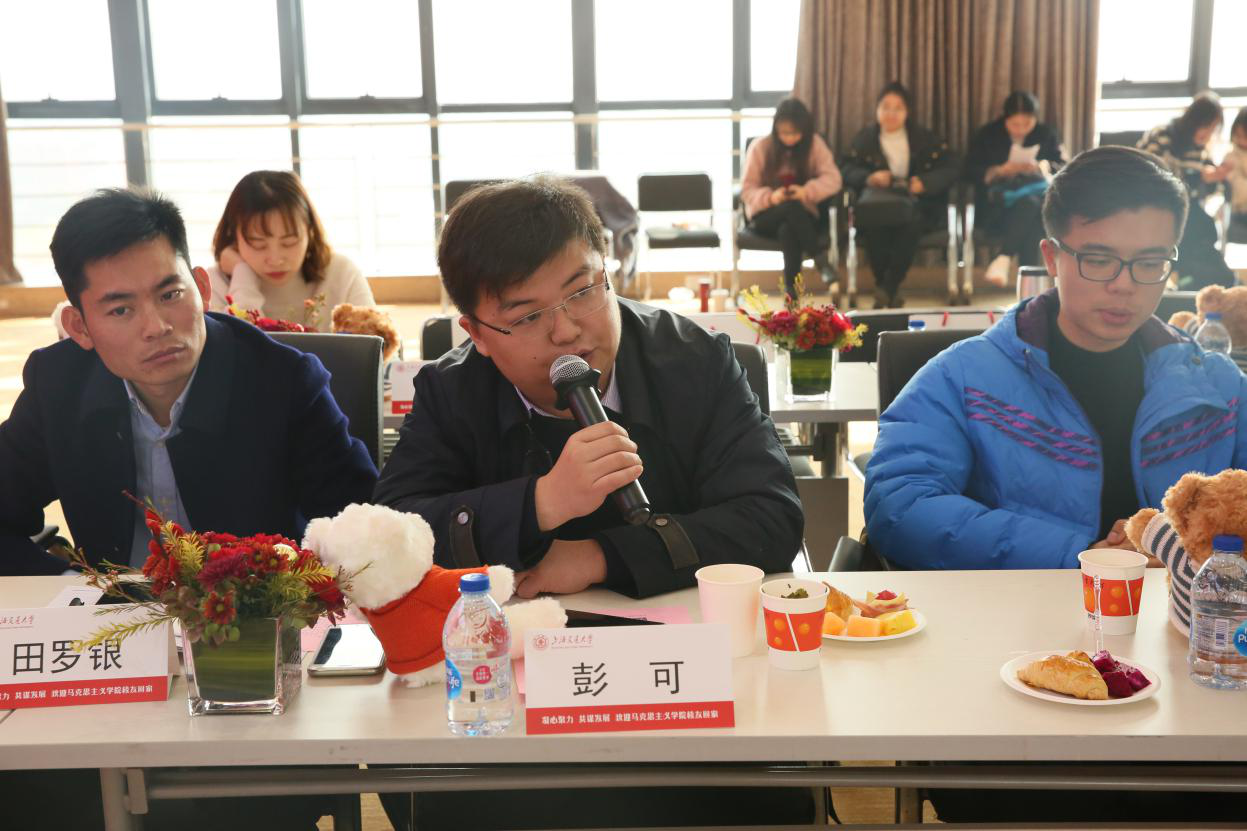 员工彭可交流了在河南省水利厅宣传部的经历,希望马院在为国家培养高端人才和维护意识形态安全工作担当责任,并鼓励学弟学妹们不忘初心,继续前进。