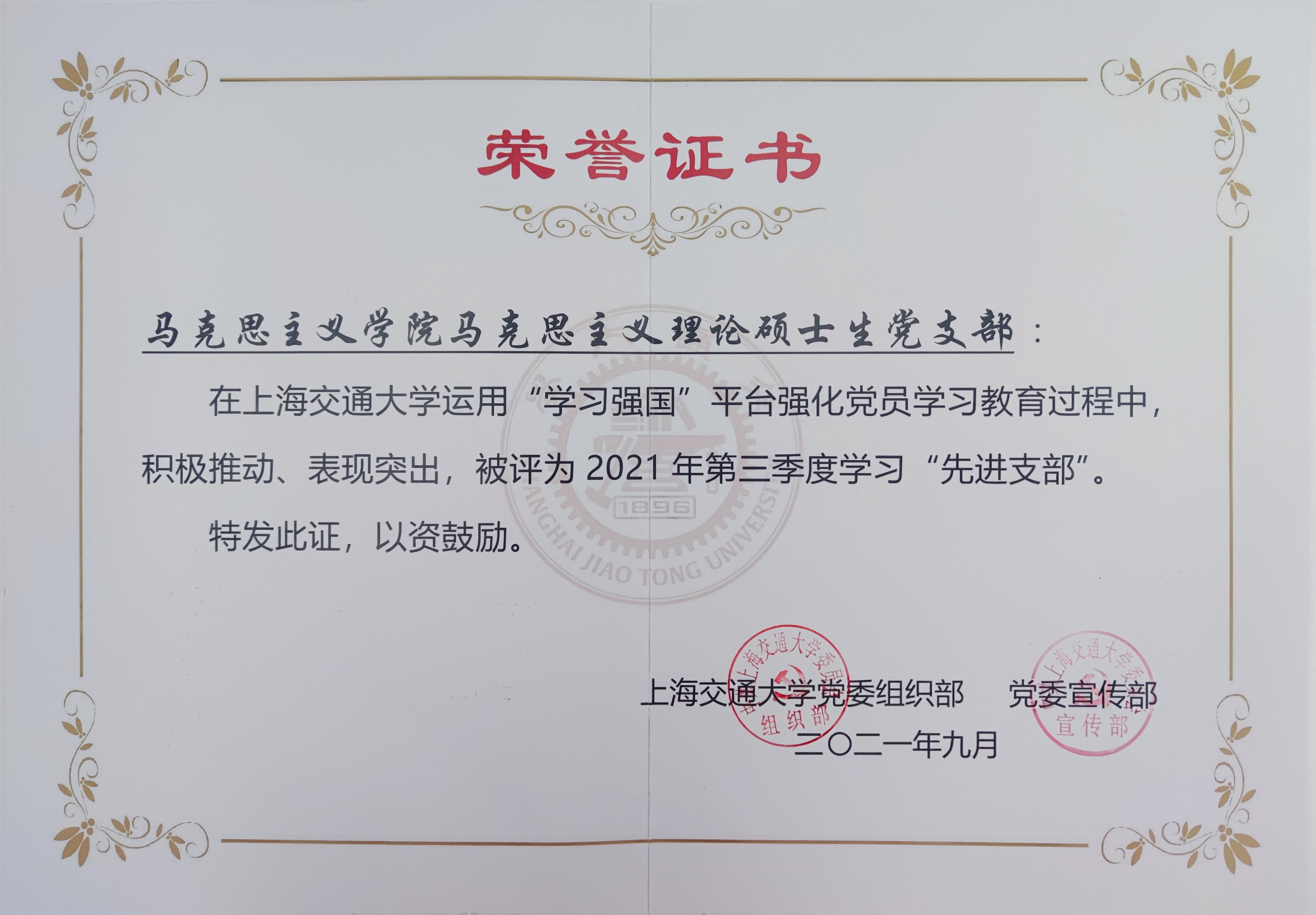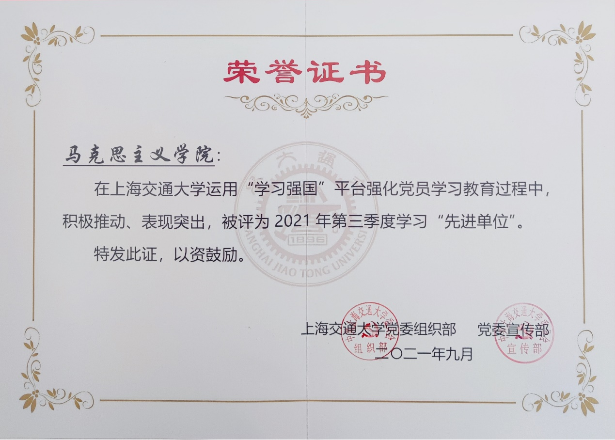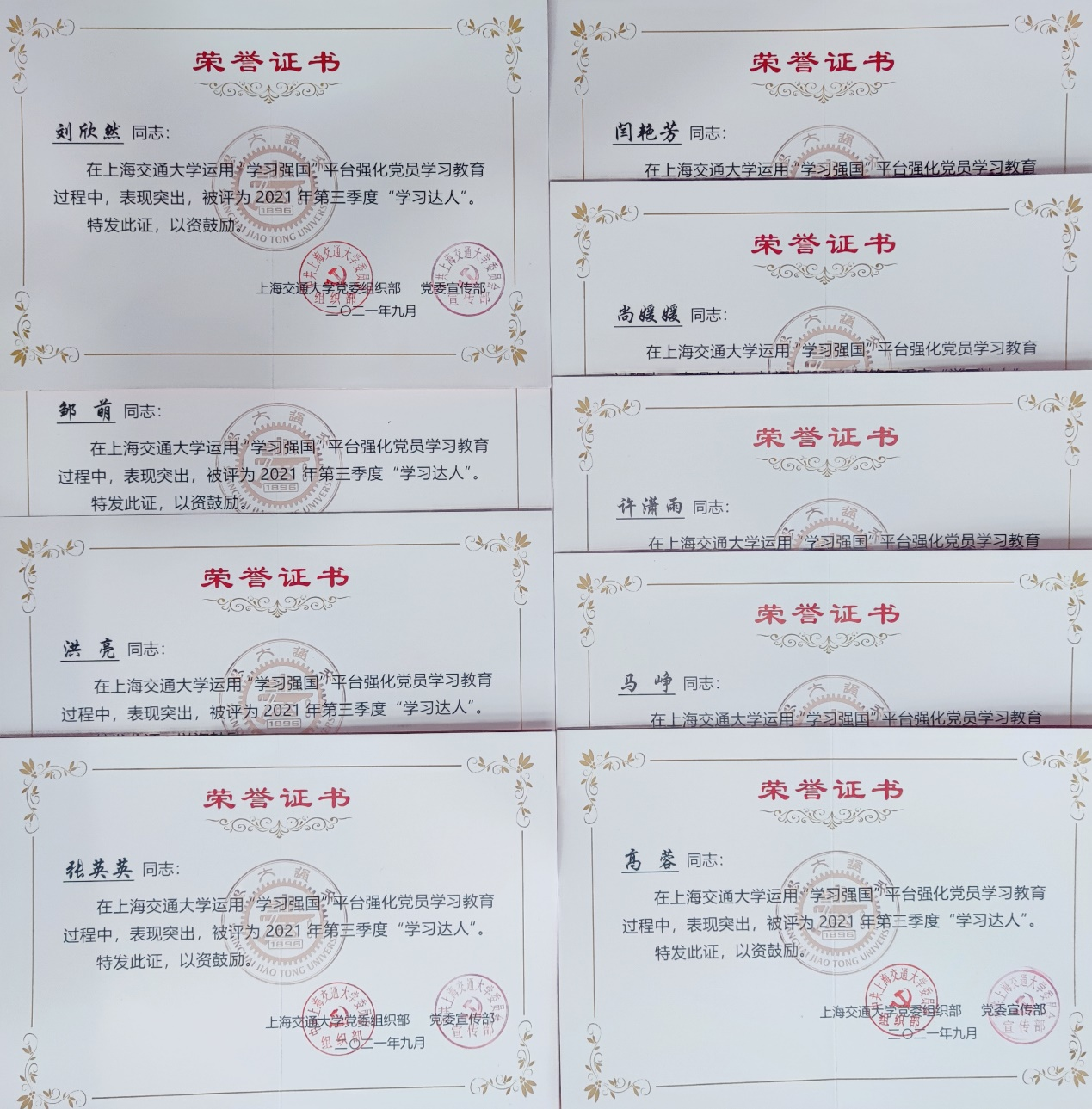 根据公司党委宣传部“学习强国”第三季度积分评比结果,1946伟德国际源自英国在本季度“学习强国”积分评比中,喜获两个集体奖、9个个人奖:公司党委获得“先进单位”,马克思主义理论硕士生党支部获得“先进支部”;刘欣然、邹萌、洪亮、张英英、闫艳芳、尚媛媛、许潇雨、马峥、高蓉等9名师生获得“学习达人”。