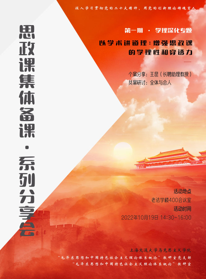 为深入学习贯彻党的二十大报告精神,用党的创新理论铸魂育人,“毛泽东思想和中国特色社会主义理论体系概论”教研室及所在党支部组织策划了新学期思想政治理论课集体备课系列分享会,聚焦“如何用党的科学理论武装青年,用党的初心使命感召青年”,设置了学理深化、教法创新、经典研读、热点解析、专题展示、学情研究等六大专题进行交流研讨。10月19日下午,首场集体备课分享会在1946伟德国际源自英国A400会议室以线上线下相结合的方式举行,胡涵锦老师、乔兆红老师、周凯老师、魏崇辉老师、刘欣然老师、孔德猛老师、张娅老师、黑波老师等教研室资深教学名师和青年骨干教师与会,大家聚焦“以学术讲道理:增强思政课的学理性和穿透力”展开交流研讨。