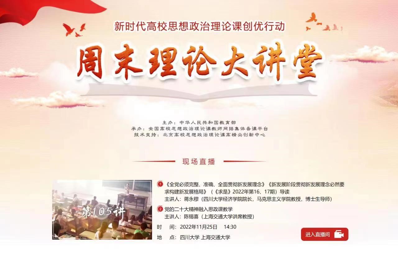 11月25日下午,公司讲席教授陈锡喜应邀在教育部主办、全国高校思想政治理论课教师网络集体备课平台“周末理论大讲堂”,以“党的二十大精神融入思政课教学”为题为全国高校思想政治理论课教师作了报告。