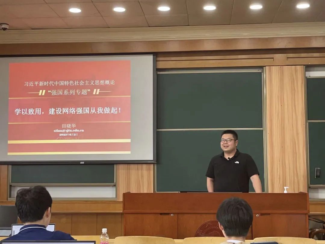 在上院515教室,师生们正在“习近平新时代中国特色社会主义思想概论”课的课堂上讨论什么是“数字中国”、如何推进“数字中国”战略。一张有关“数字中国”的宏伟蓝图,正通过电子信息与电气工程公司田晓华教授的生动话语描绘开来,田老师结合习近平总书记关于“数字中国”的重要论述和自身丰富的科研经历,让同学们深刻领悟到建设数字中国是数字时代推进中国式现代化的重要引擎,是构筑国家竞争新优势的有力支撑。