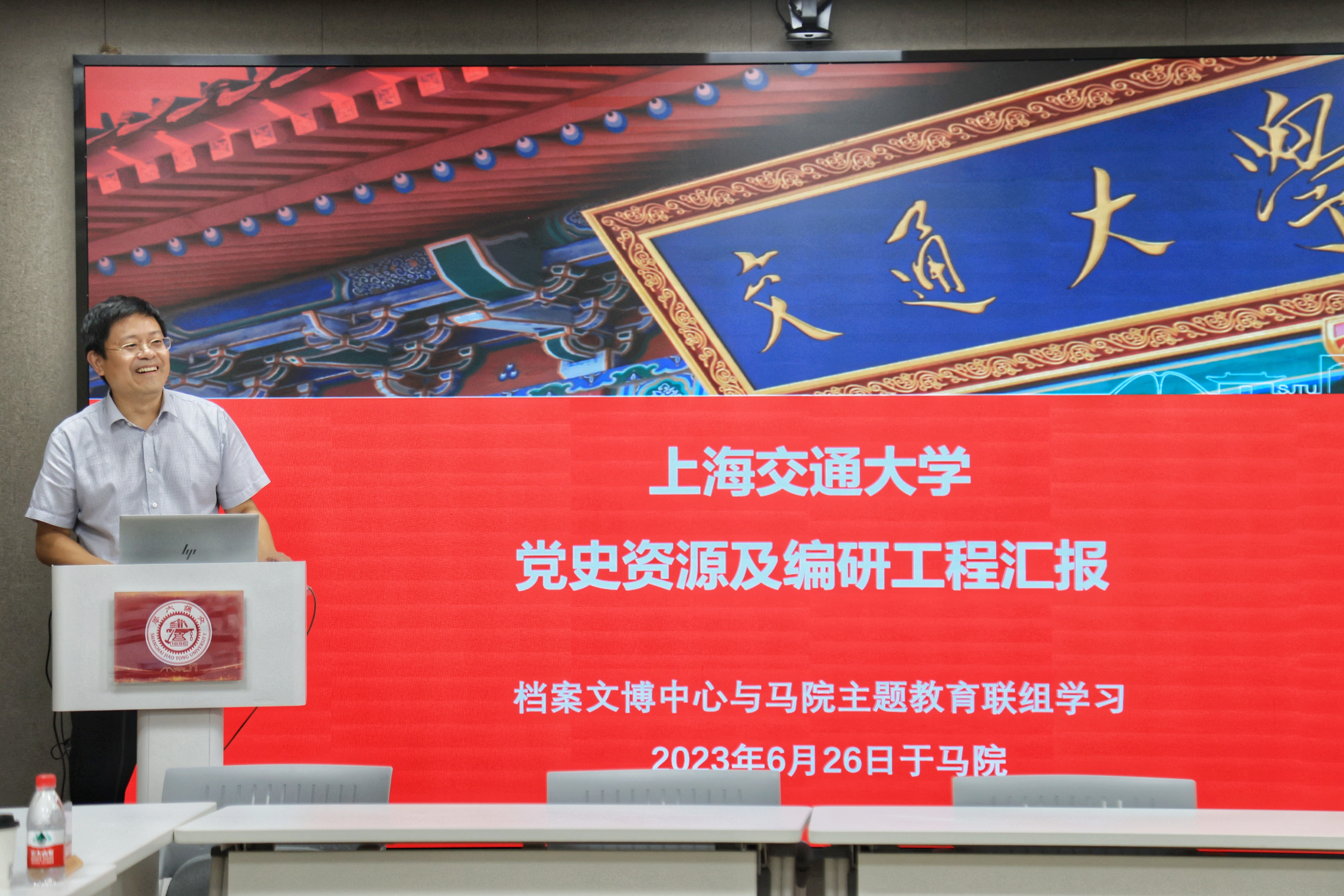 首先,欧七斤以《党史资源及编研工程汇报》为题作主题报告,他从“交大红色资源”“党史工程”“思政育人”等三个方面展开详细介绍。他强调,要持续拓展思政育人的红色资源和平台阵地,不断提升以史育人的品质与层次。他表示,作为一名思政教师,要将校史内容巧妙地融入到思政课的教学过程中,促进员工们对于思政课程内容的情感共鸣、理论共鸣和思想共鸣。