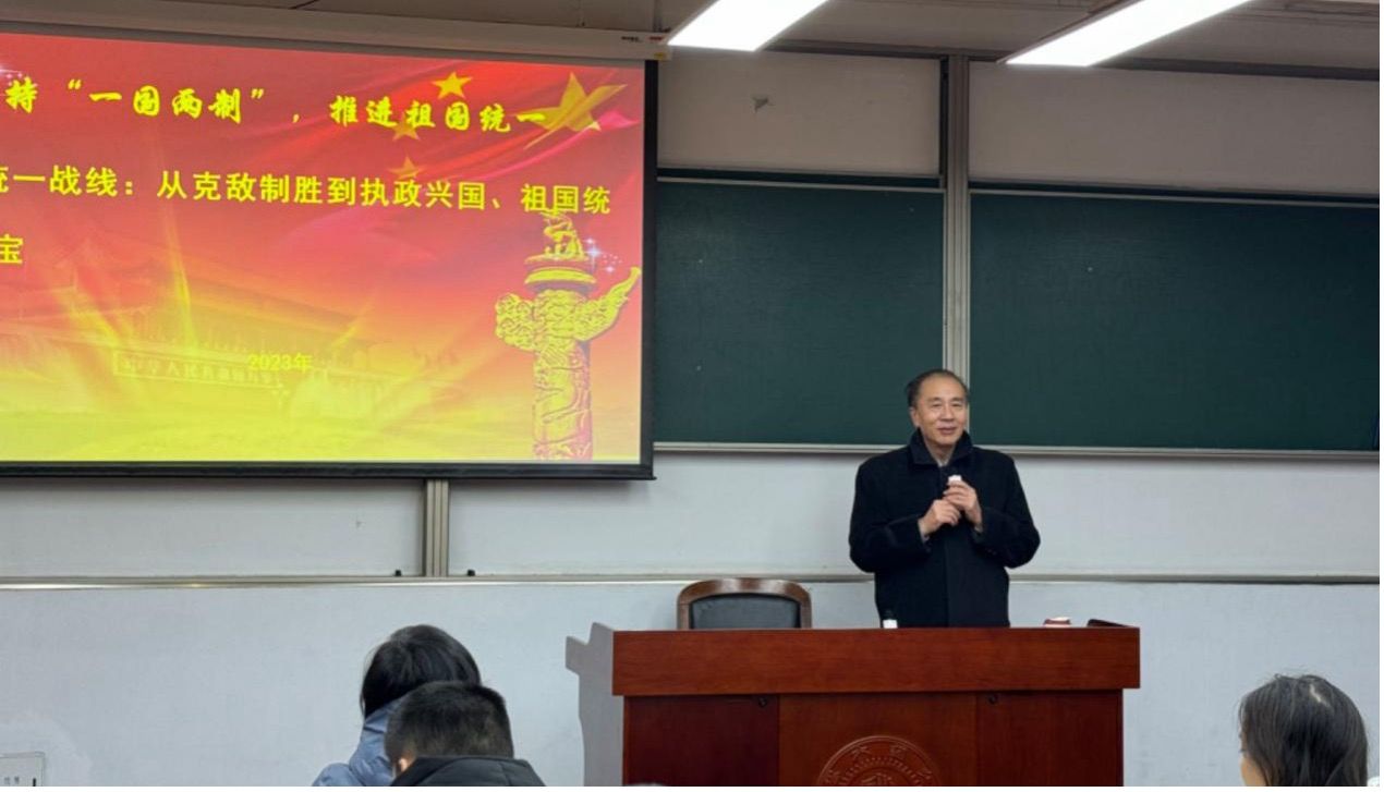 2023年12月20日晚,上海市社会科学界联合会副主席、上海市中共党史学会会长、上海市高校思政课教学指导委员会副主任、上海大学原党委副书记、博士生导师忻平教授,围绕统一战线,为“习近平新时代中国特色社会主义思想概论”课员工作了主题为“坚持‘一国两制’,推进祖国统一”的专题讲座。