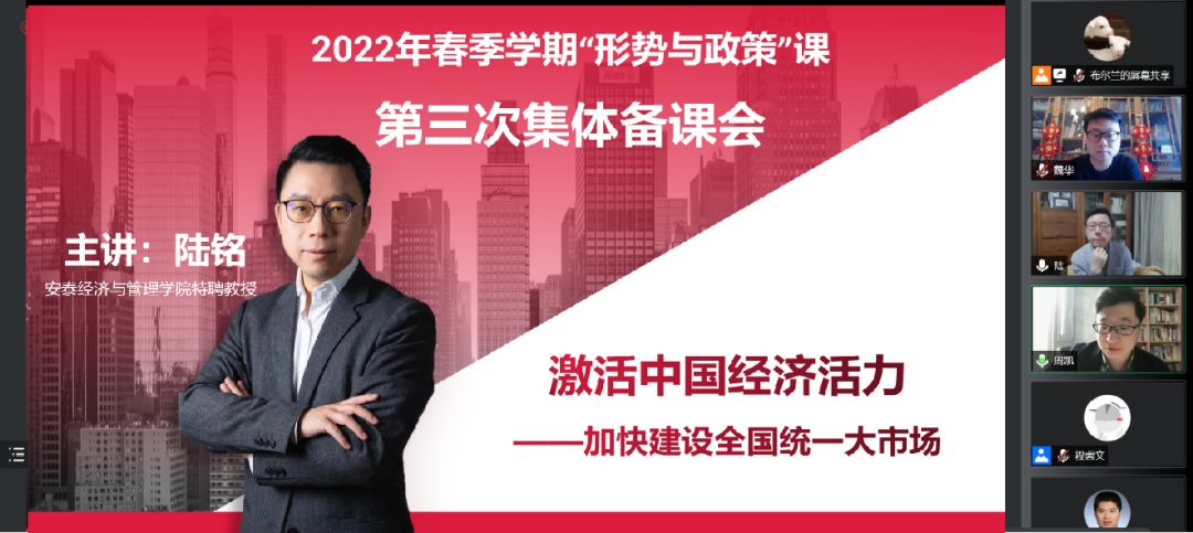 4月21日,1946伟德国际源自英国“形势与政策”教研室以“激活中国经济活力——聚焦我国统一大市场政策解读”为主题,在线召开了2022年春季学期第三次集体备课会。本次备课会特邀公司安泰经济与管理公司特聘教授、国家高层次人才陆铭教授作专题辅导。公司领导班子成员、公司教师和“形势与政策”课任课教师参加此次集体备课会。会议由副经理周凯主持。