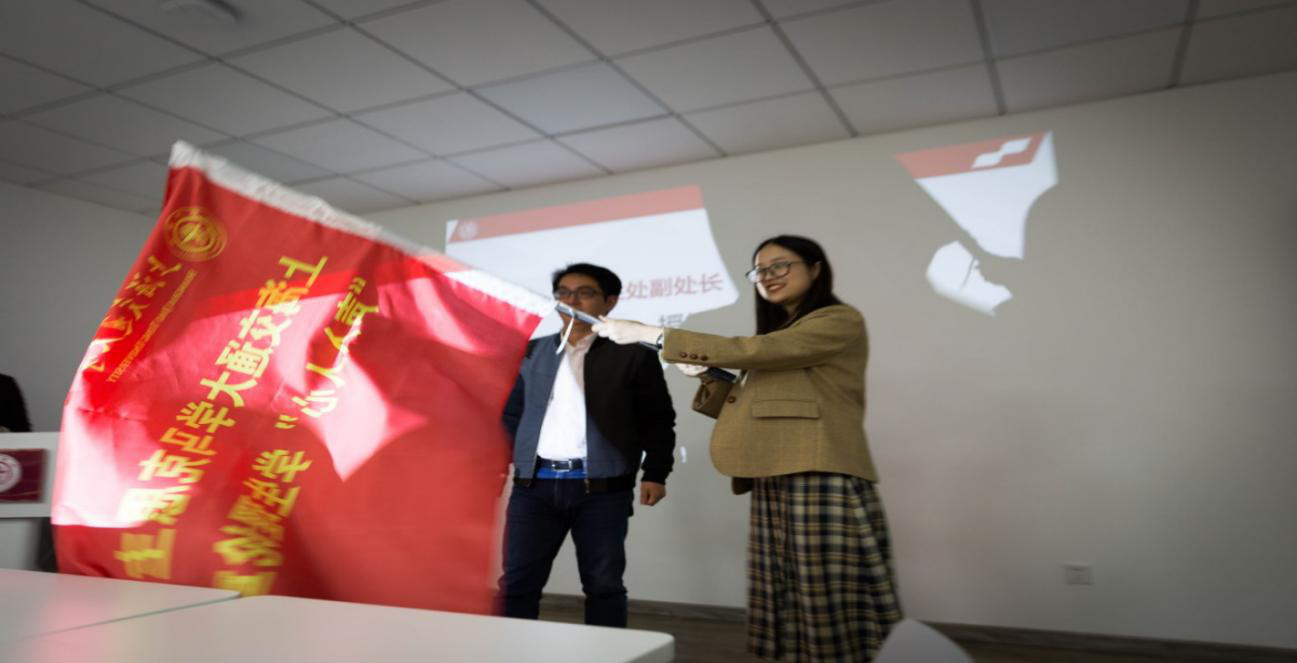 员工处副处长龚强向宣讲团负责人舒雅婷授旗。