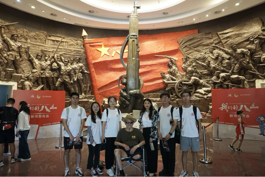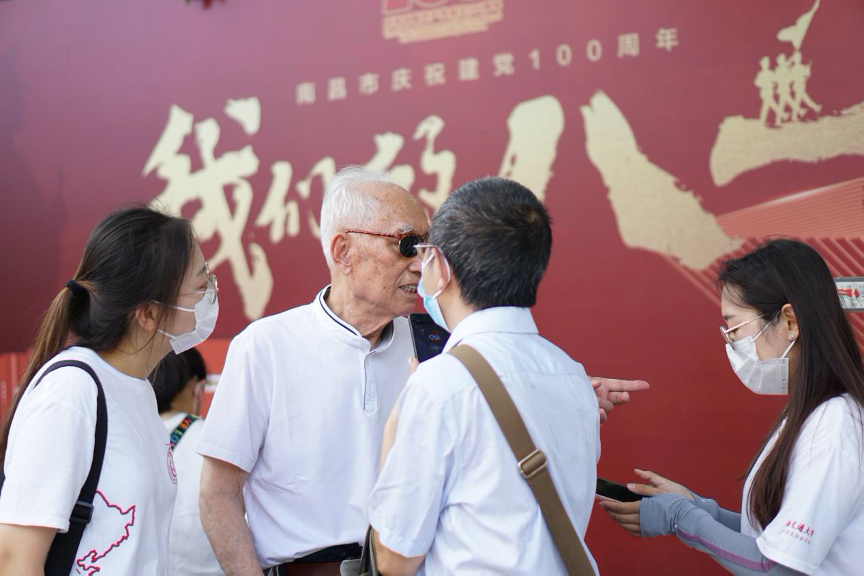 实践团成员观看了由南昌八一起义纪念馆、共青团南昌市委和江西教育出版社共同主办的《我们的八一》新书发布会,并采访了受邀老战士代表李潭清同志。李谭清老战士1945年参加八路军,1950年入党,历任二十八军第二十九师战士、卫生员,曾参加了抗日战争及泰安战役、莱芜战役、孟良崮战役、济南战役、中原战役、淮海战役、渡江战役、解放大上海战役、福厦战役等重大战役;先后荣获“解放奖章”“中原战役纪念章”“淮海战役纪念章”“渡江战役纪念章”“抗战胜利70周年纪念章”“建国70周年纪念章”等。回忆起艰难的作战岁月和自己的毕生经历,李谭清老战士很是感慨,他嘱咐实践团成员:“你们都是老员工、研究生,毛主席讲世界是你们的,也是我们的,但是归根结底是你们的。你们青年人朝气蓬勃,正在兴旺时期,好像早晨八九点钟的太阳,希望寄托在你们身上。”实践团成员听完李潭清老战士的讲述十分触动,表示一定不忘老战士的嘱托“为祖国建设服务,报效祖国”。